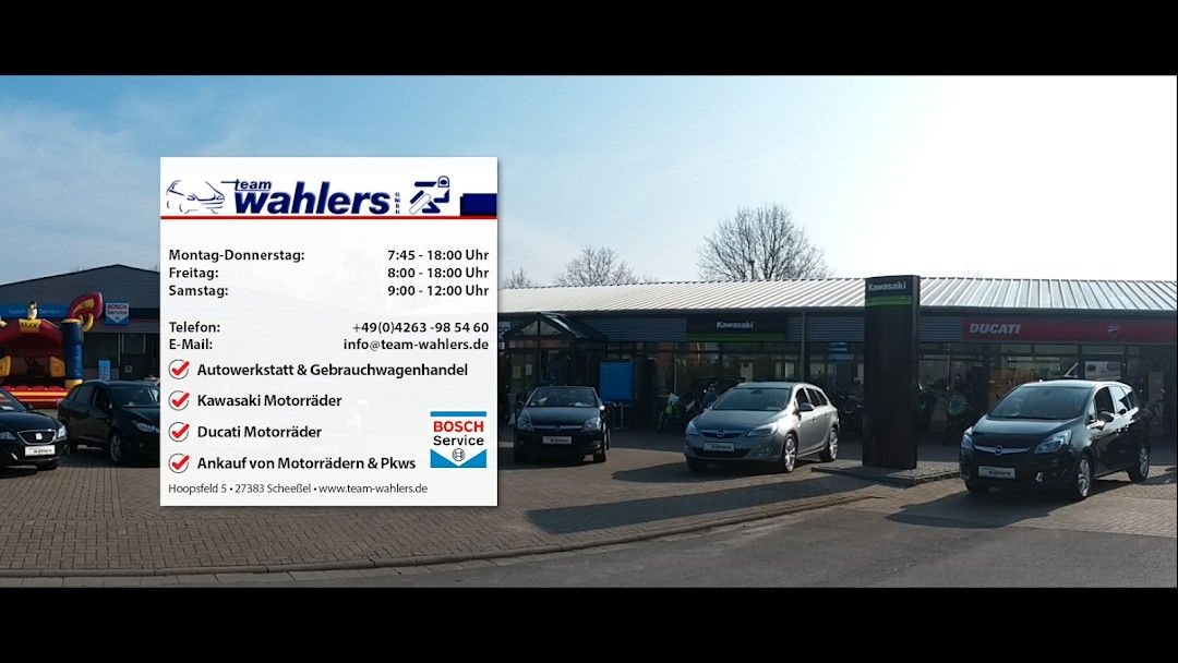 Wir liefern Ihnen Ihr Motorrad bundesweit durch unsere Partnerspedition gegen einen geringen Aufpreis an. Wir vereinbaren dann mit Ihnen einen Liefertermin für das Fahrzeug. Der Bahnhof Scheeßel ist nur 5 Gehminuten von unserem Geschäft entfernt.Auto- & Motorrad Team Wahlers GmbH - Ihr Kawasaki-und Ducati-Vertragshändler Mitte Hamburg-Bremen an der B 75.Triumph-Servicehändler & Kymco-Vertragshändler - Hyosung & F.B.MondialOffizieller BOSCH Car-Service.Autos, Motorräder und mehr.